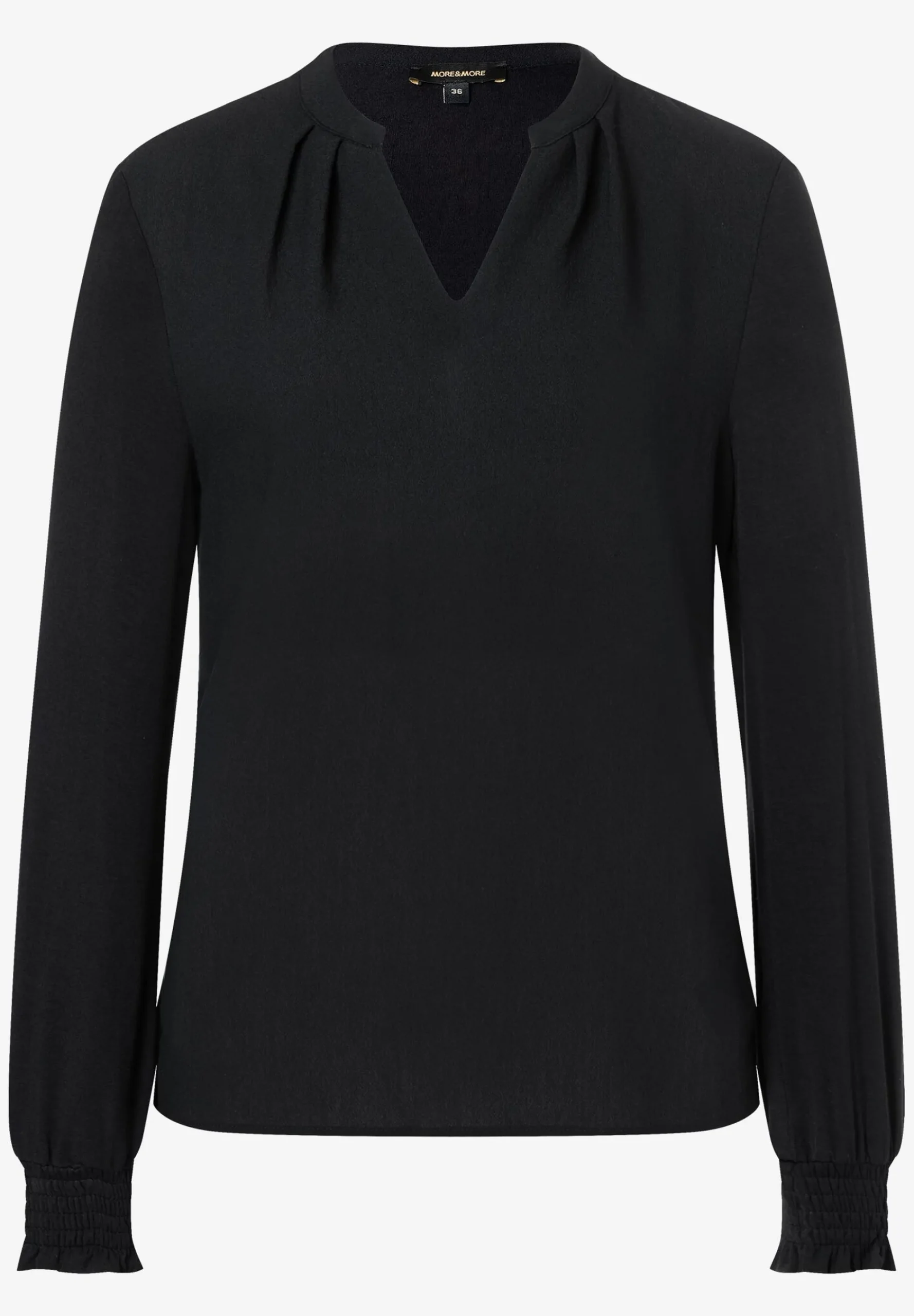 Das feminine Blusenshirt von MORE & MORE mit Stehkragen und kleinem V-Ausschnitt ist sehr vielseitig kombinierbar und bietet eine tolle Mischung aus Bluse und Shirt.