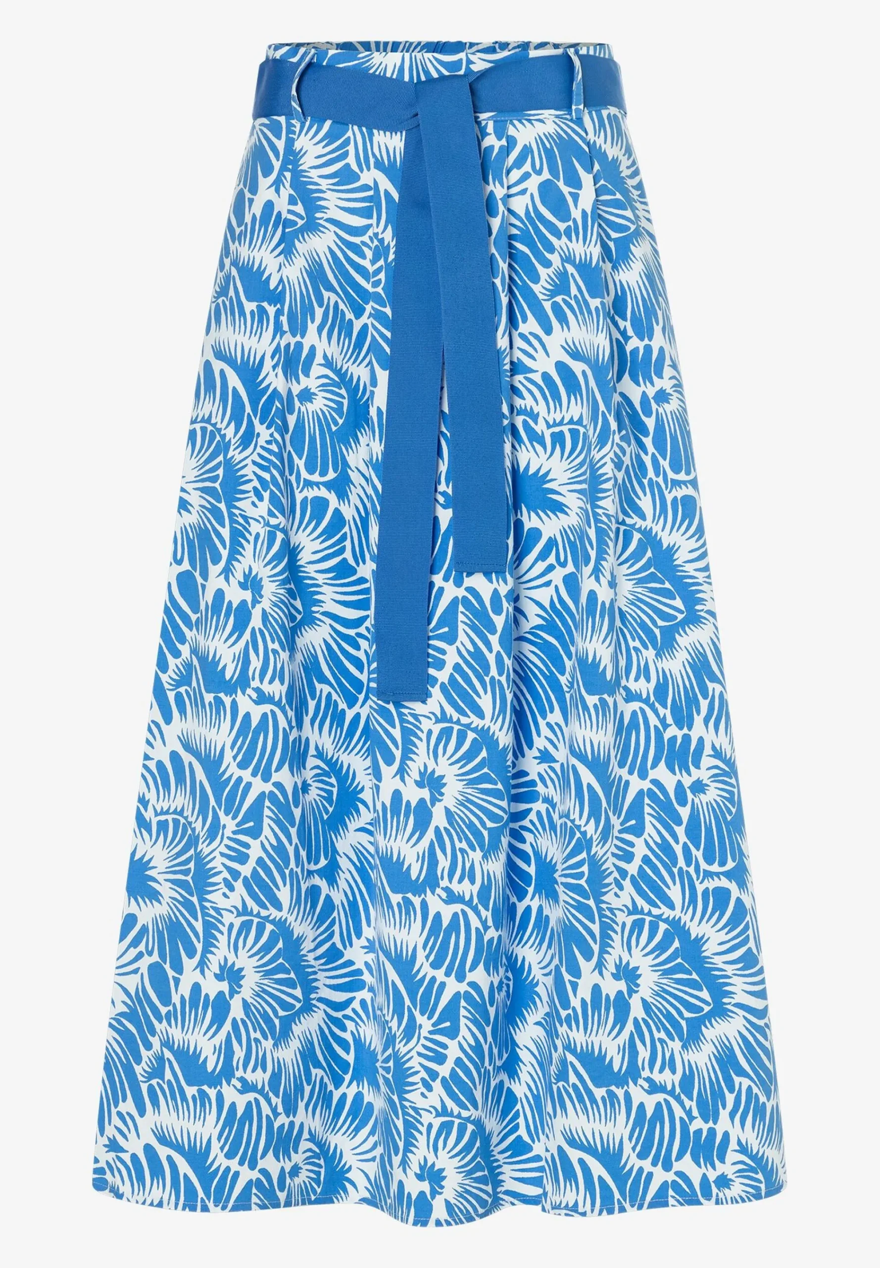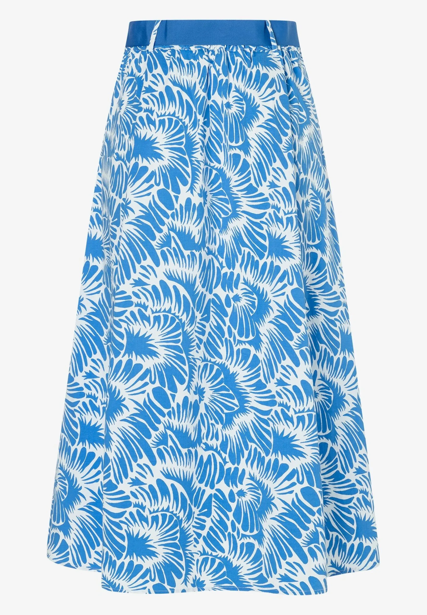 Den weit-ausgestellten Baumwollrock von MORE & MORE mit abstraktem Flowerprint in blau/weiß und blauem Ripsgürtel können Sie ganz casual mit T-Shirt und Sneakers stylen oder aber etwas eleganter mit Blusentop und Heels.
