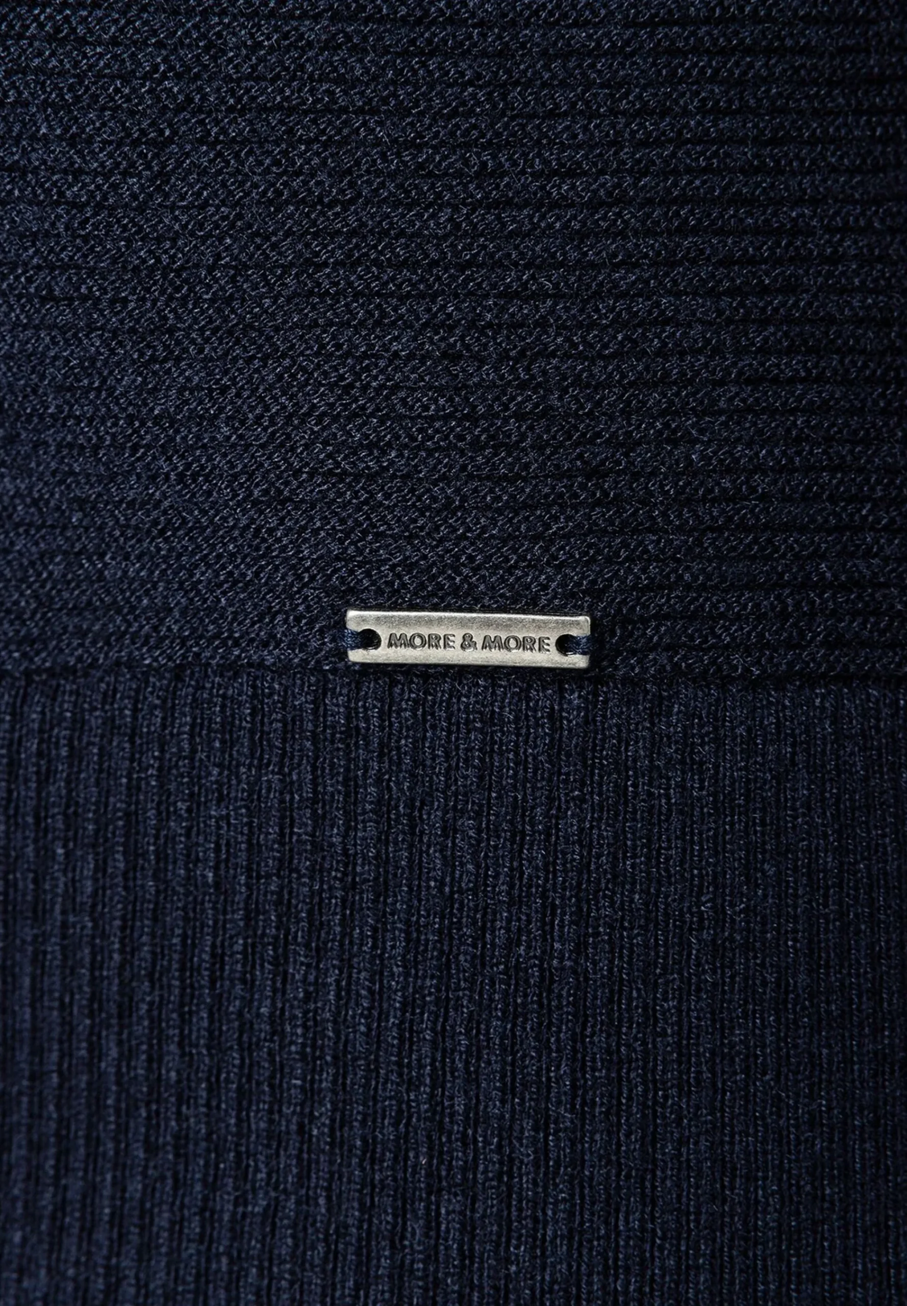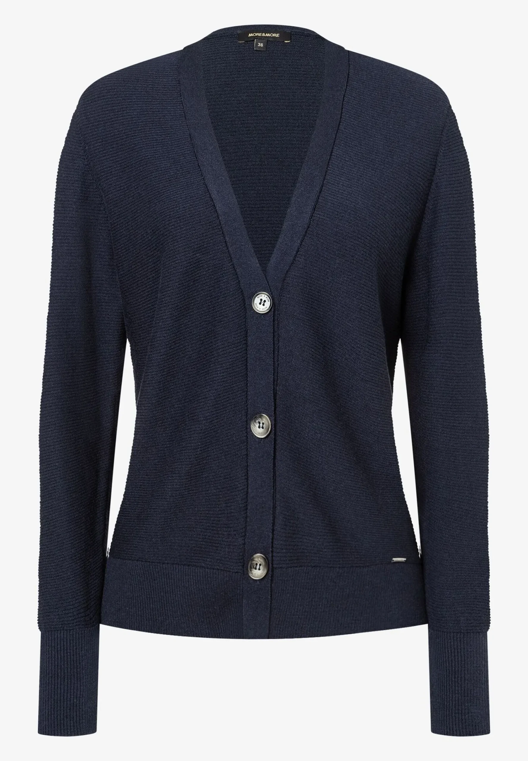 Der lässige Cardigan von MORE & MORE mit tiefem V-Ausschnitt und feiner Rippenstruktur kann sportiv mit Jeans gestylt werden, aber auch klassisch mit Nadelstreifenhose.