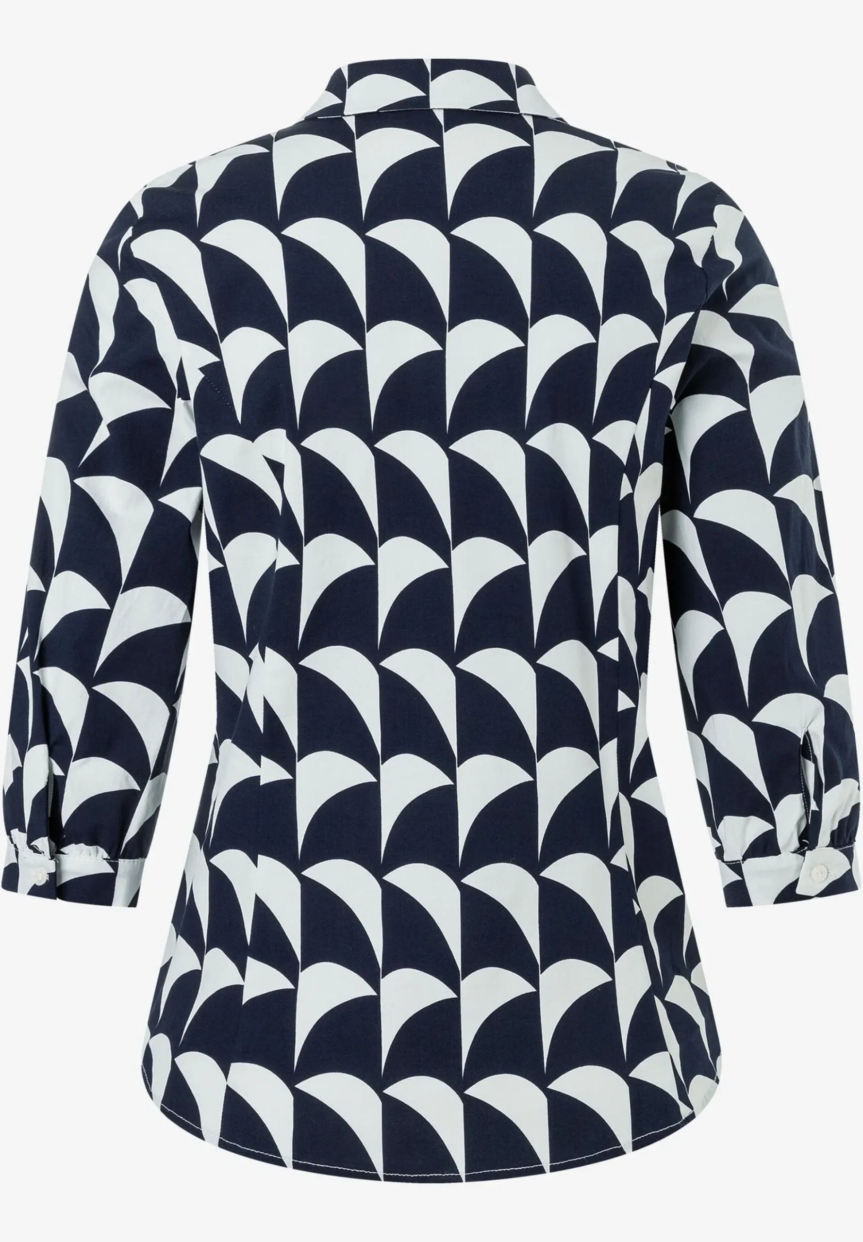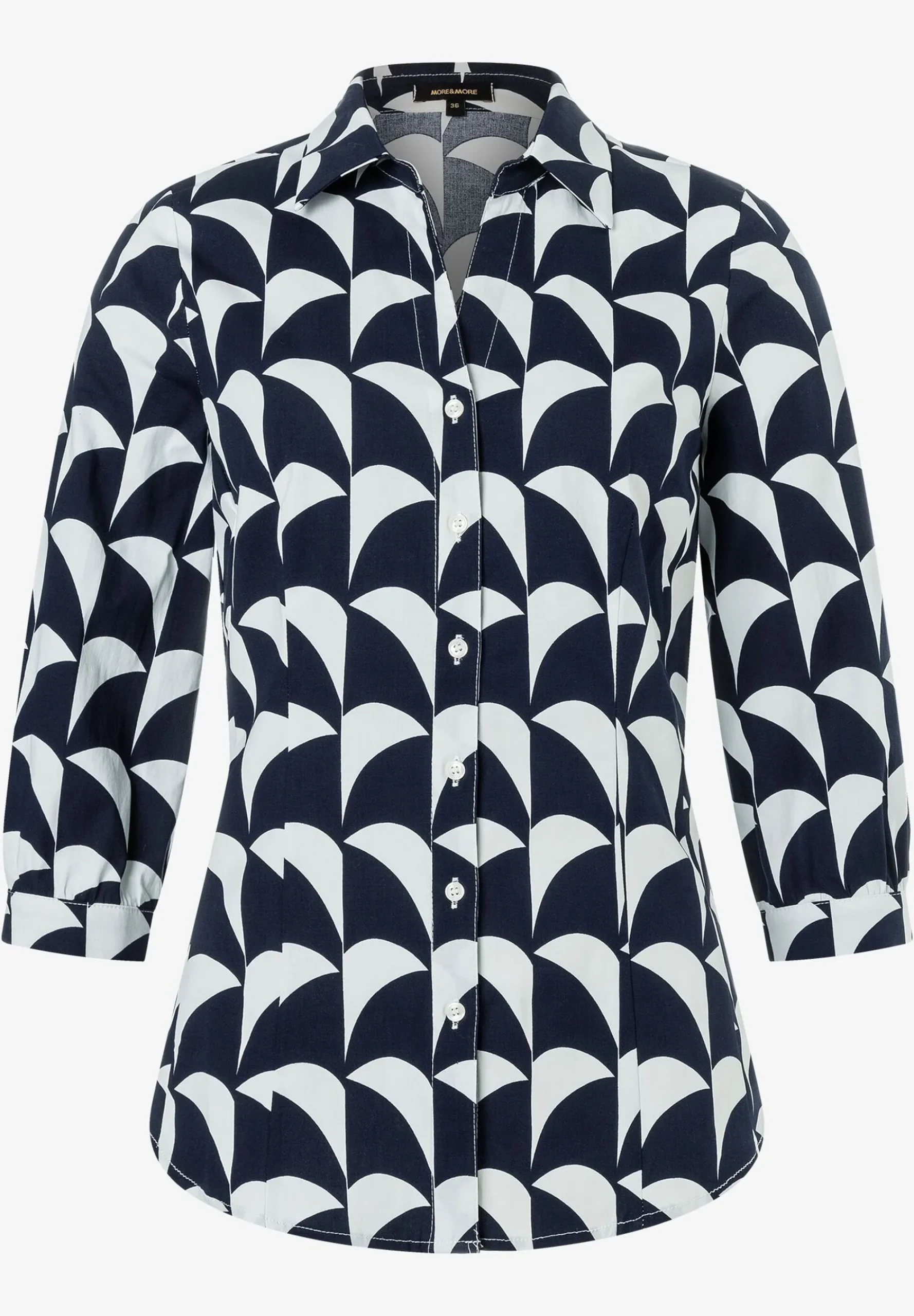 Die taillierte Hemdbluse von MORE & MORE mit 3/4 langen Ärmeln und 2-farbigem Allover-Print in marine/ecru kann sowohl zum klassischen Businessanzug kombiniert werden, als auch zur lässigen Jeans oder sportiven Chino.