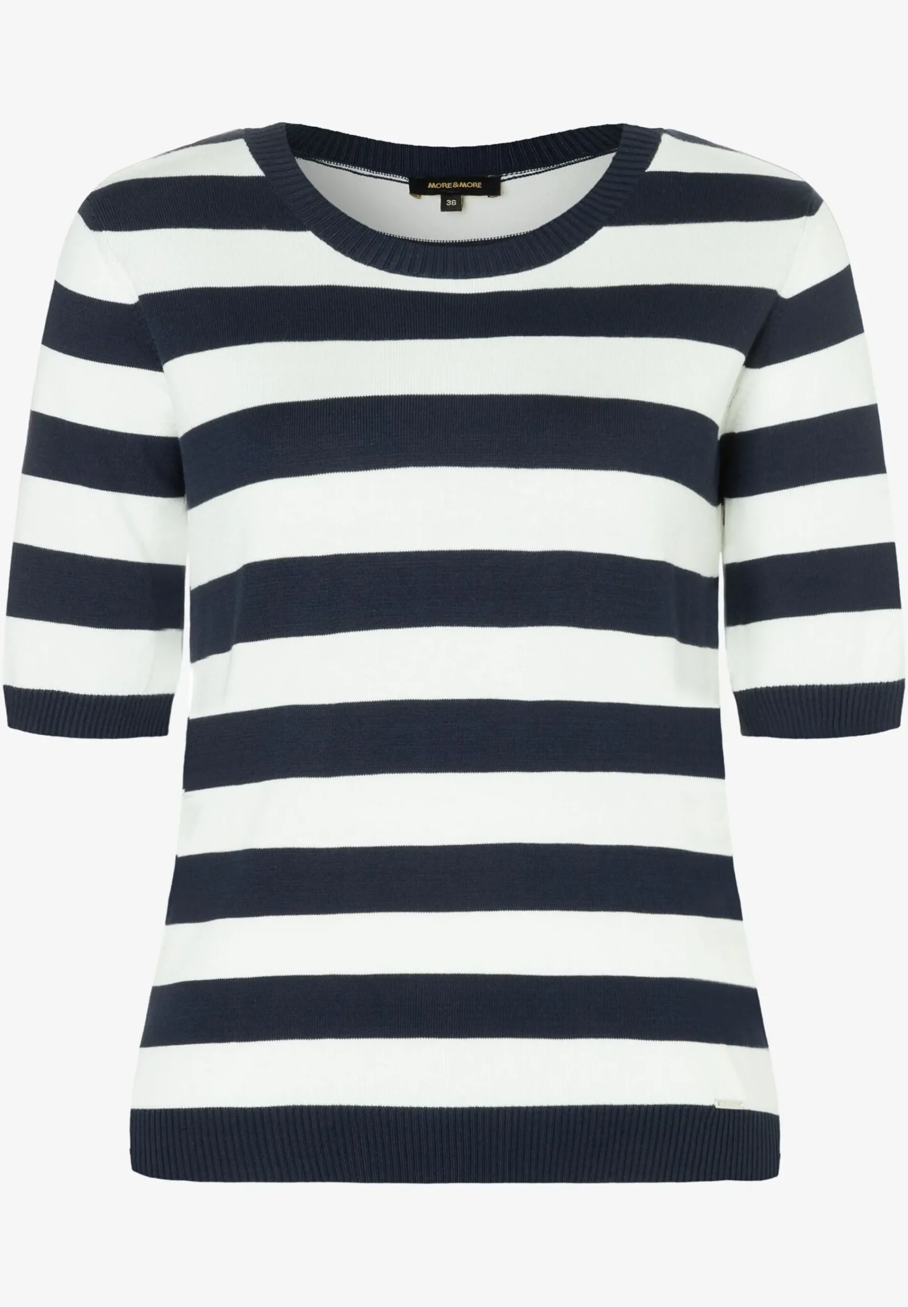 Der attraktive Feinstrick-Pullover von MORE & MORE mit längerem Halbarm und Blockstreifen lässt sich vielseitig kombinieren. Er passt sowohl zur klassischen Businesshose, als auch zum femininen Tüllrock oder zur lässigen Jeans.