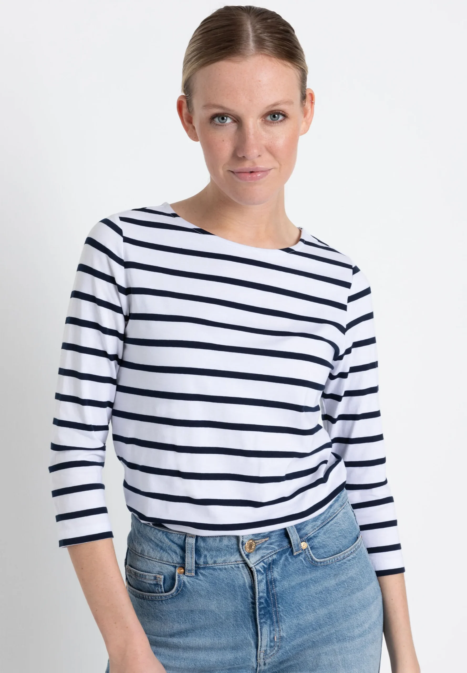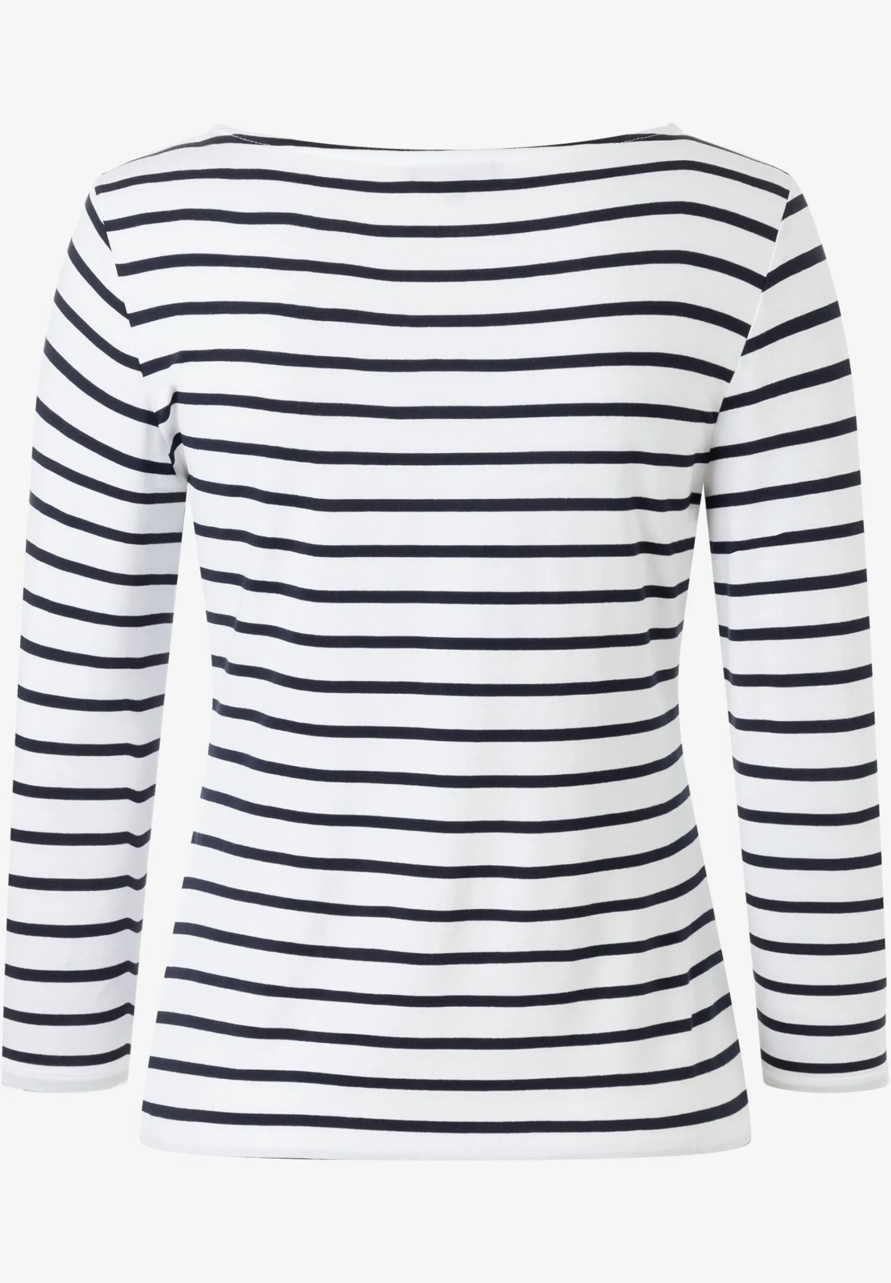 Ein absoluter „Evergreen“ von MORE & MORE ist das zweifarbige Ringelshirt mit 3/4 langen Ärmeln und U-Boot Ausschnitt. Es funktioniert zum seriösen Businessanzug genauso gut wie zur verwaschenen Jeans.