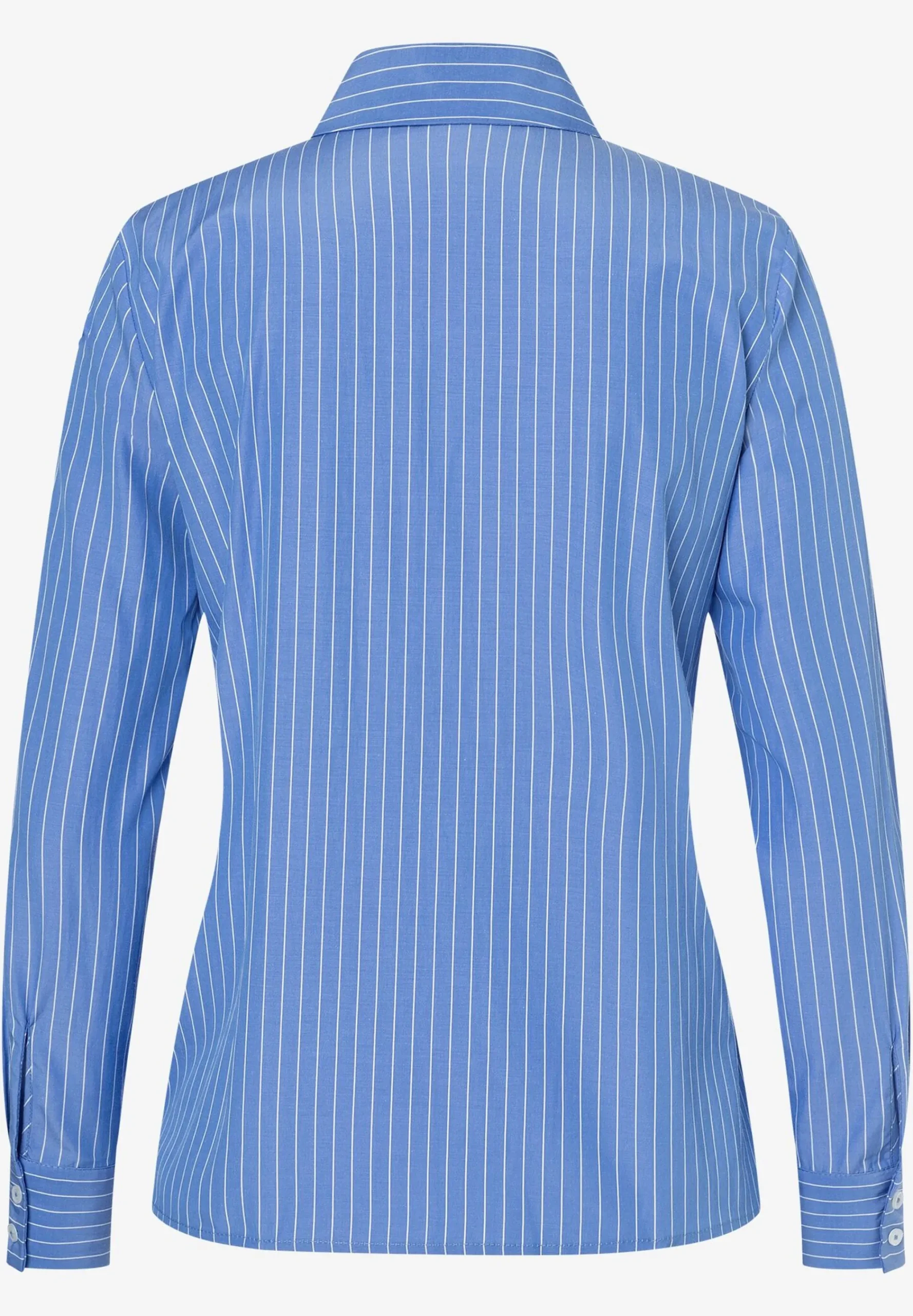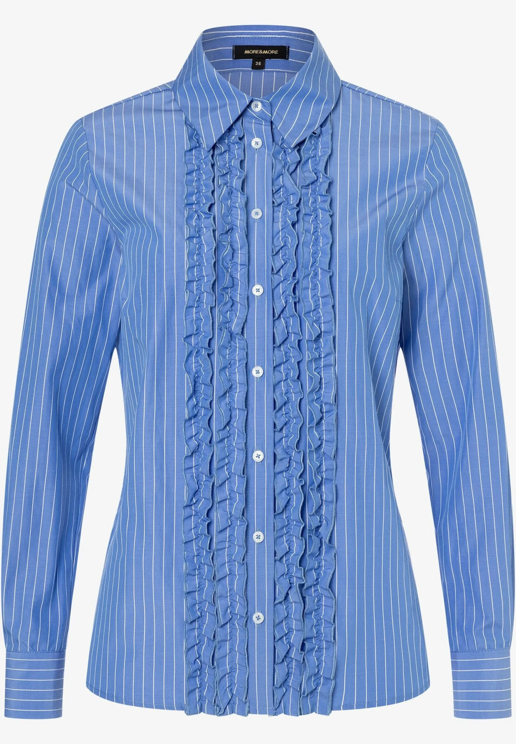 Die hochgeschlossene Hemdbluse von MORE & MORE mit feinen Nadelstreifen und femininen Rüschen auf der Front ist eine stylishe Ergänzung zum klassischen Businessanzug. Sie kann aber genauso gut mit weiter Marlenehose oder fließender Culotte kombiniert werden.