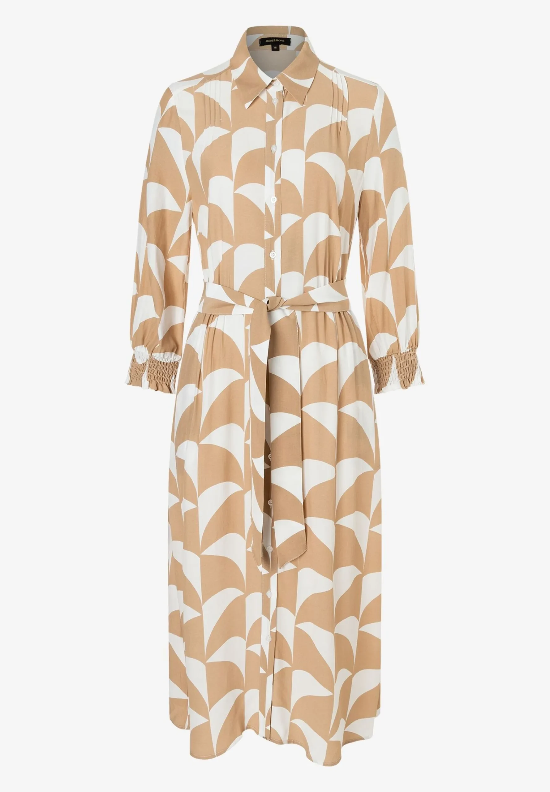 Das durchgeknöpfte Printkleid von MORE & MORE mit grafischem Dessin in offwhite/camel kann jetzt mit rustikalem Cardigan und Stiefeletten gestylt werden und bei steigenden Temperaturen mit Jeansjacke und Sneakers.