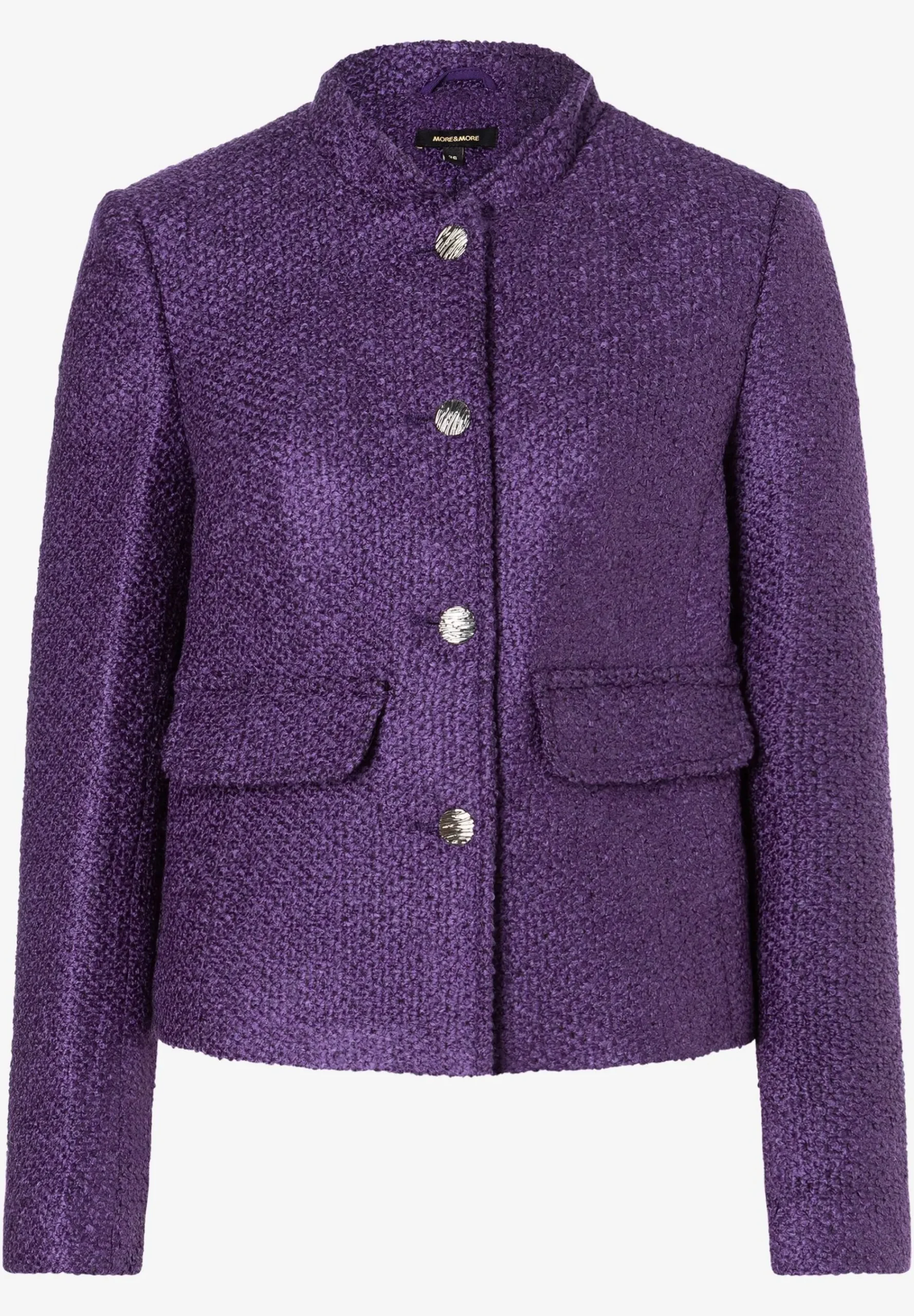 Der lilafarbene Bouclé-Blazer von MORE & MORE sieht mit passendem Rock und Heels sehr „ladylike“ aus, kann aber auch ganz lässig mit Jeans und Boots gestylt werden.