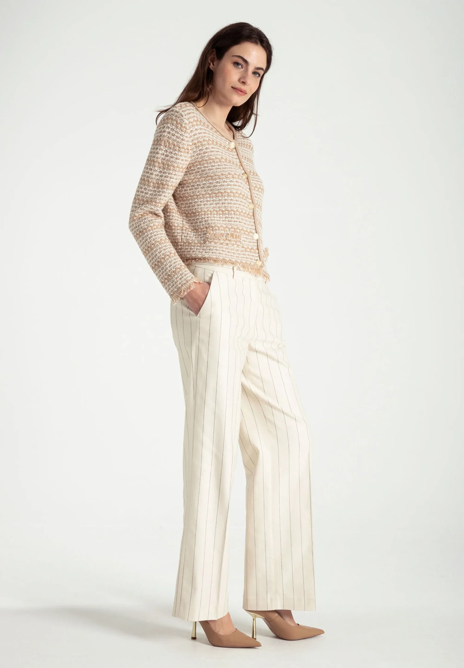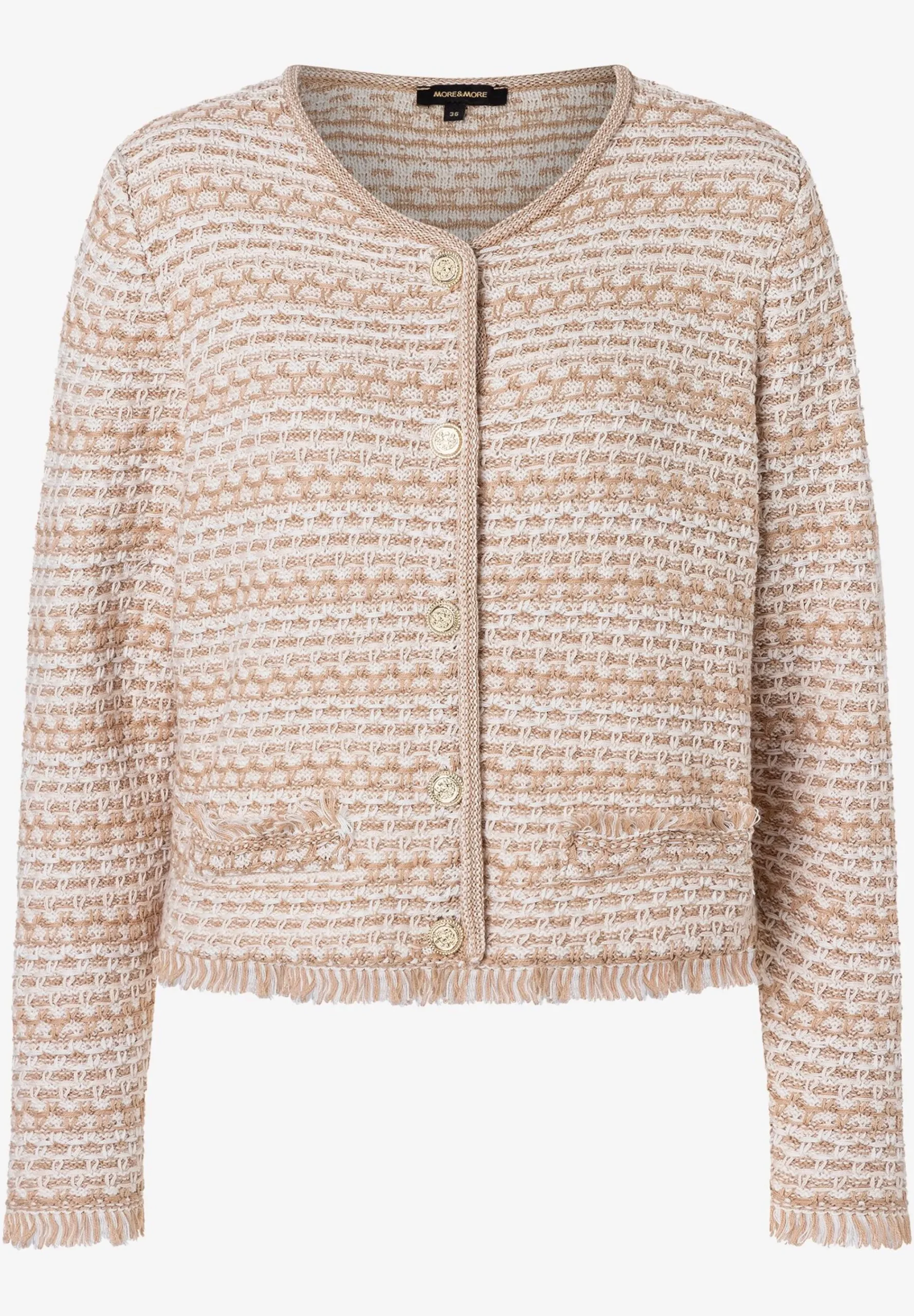 Den camel/beige gemusterten Cardigan von MORE & MORE mit goldfarbenen Knöpfen können Sie sehr vielseitig stylen, mal elegant mit Marlenehose und Heels, mal lässig mit verwaschener Jeans und Sneakers.