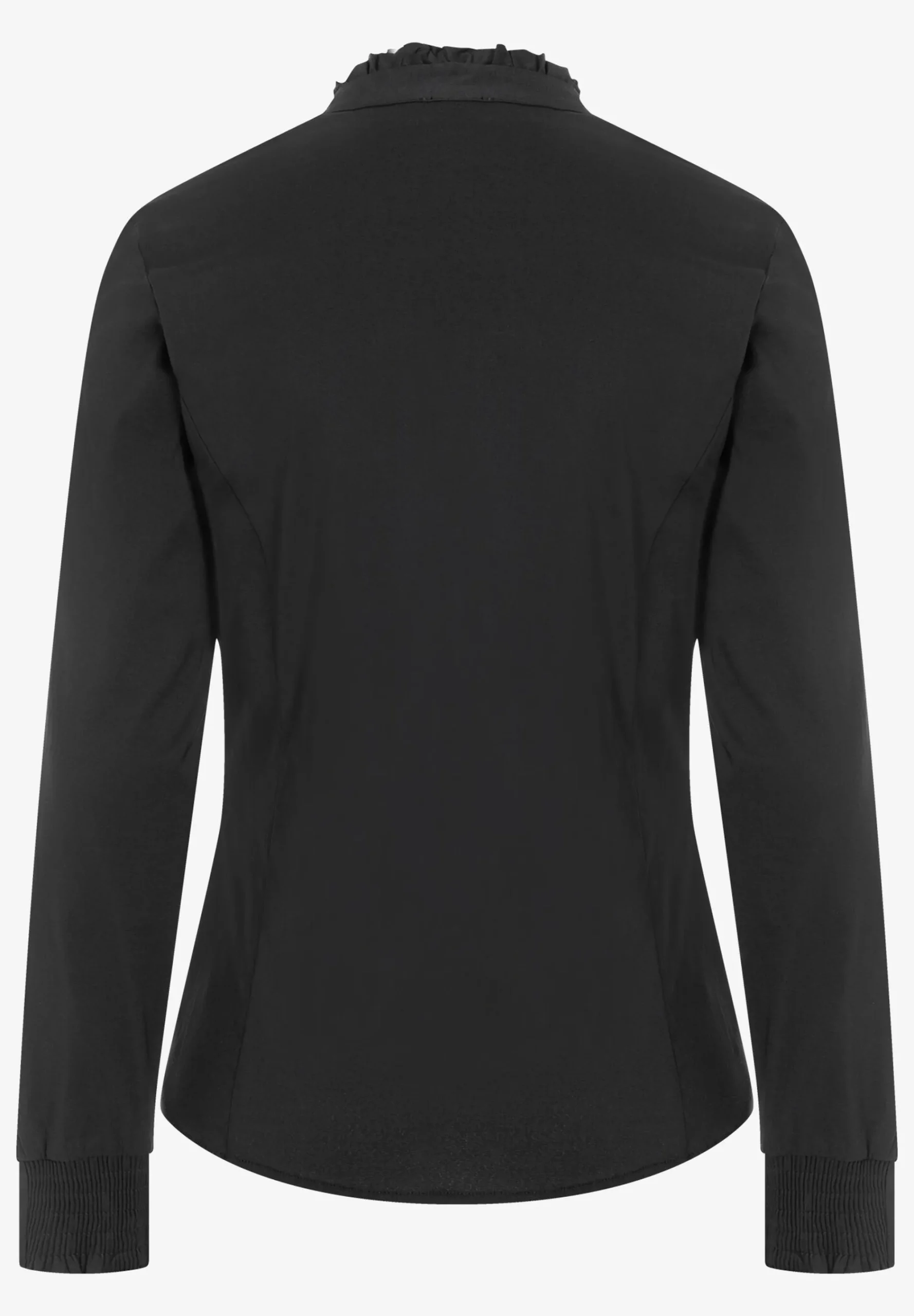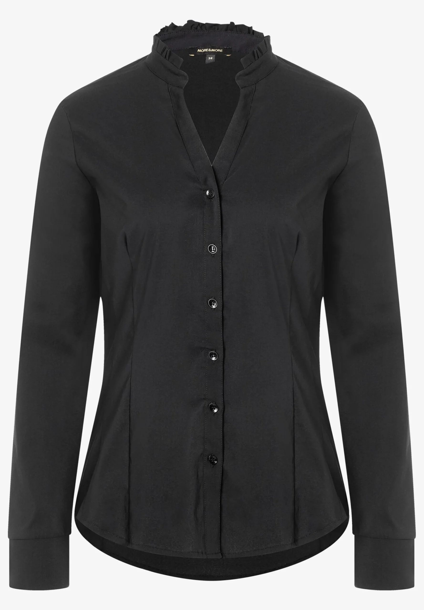 Die feminine Baumwoll/Stretch Bluse von MORE & MORE mit kleinem Stehkragen und Rüschenkante sieht unter Blazern, Cardigans und Pullovern gleichermaßen gut aus.
