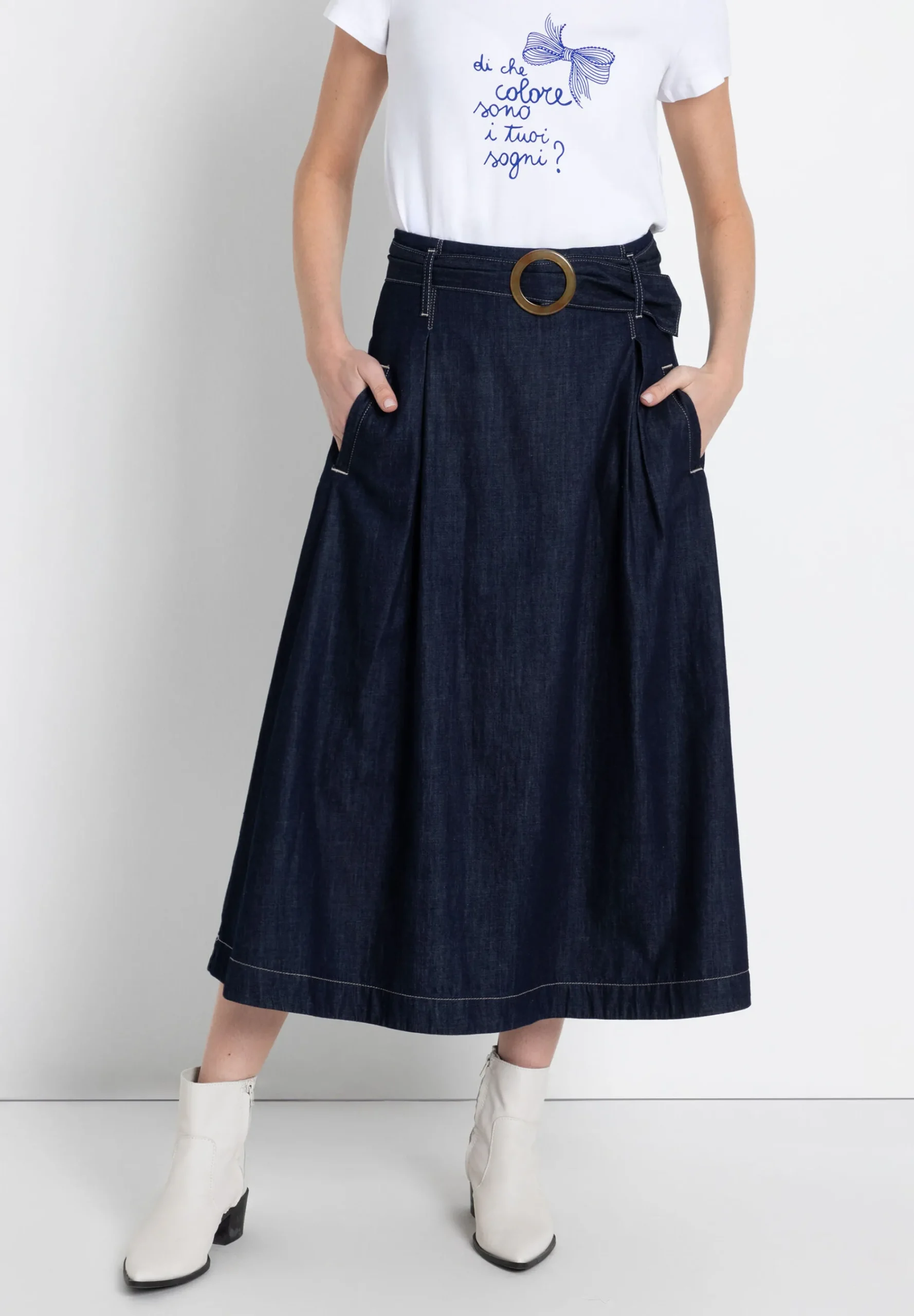 Der lange Jeansrock von MORE & MORE ist ein Allround-Talent, egal ob mit Ringelshirt und Sneakers oder mit rustikalem Pullover und Boots, Sie sehen damit immer super gestylt und lässig aus.