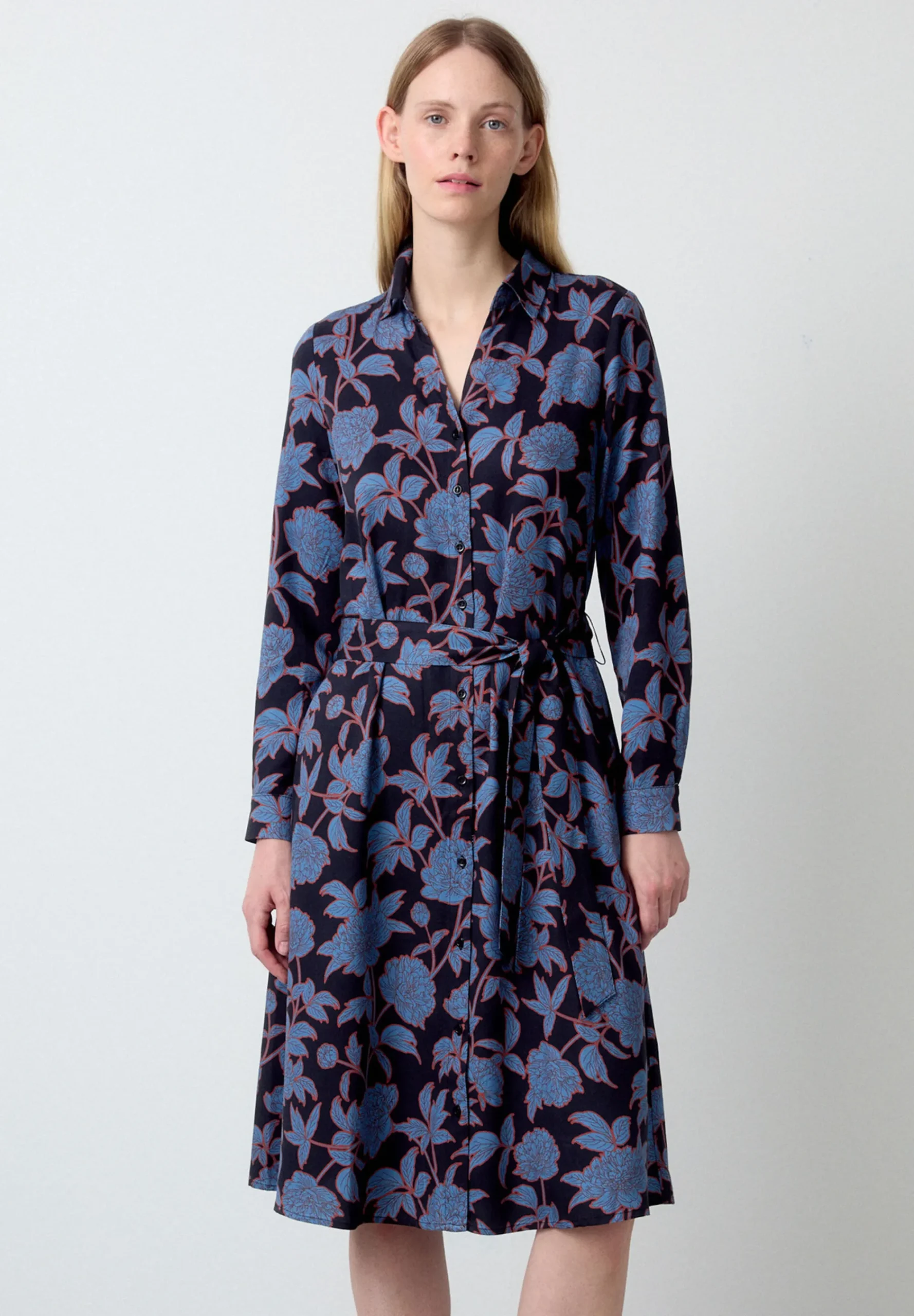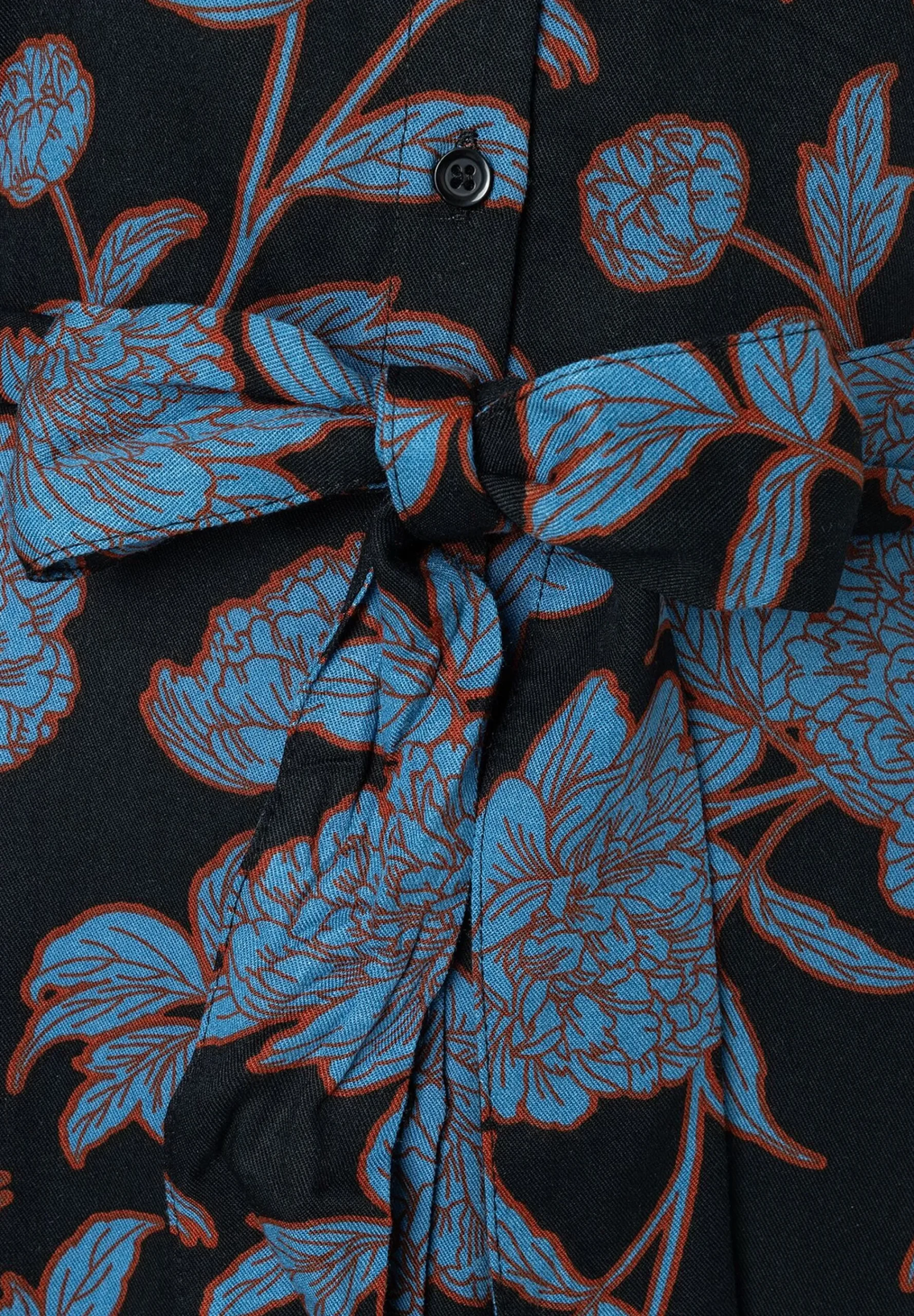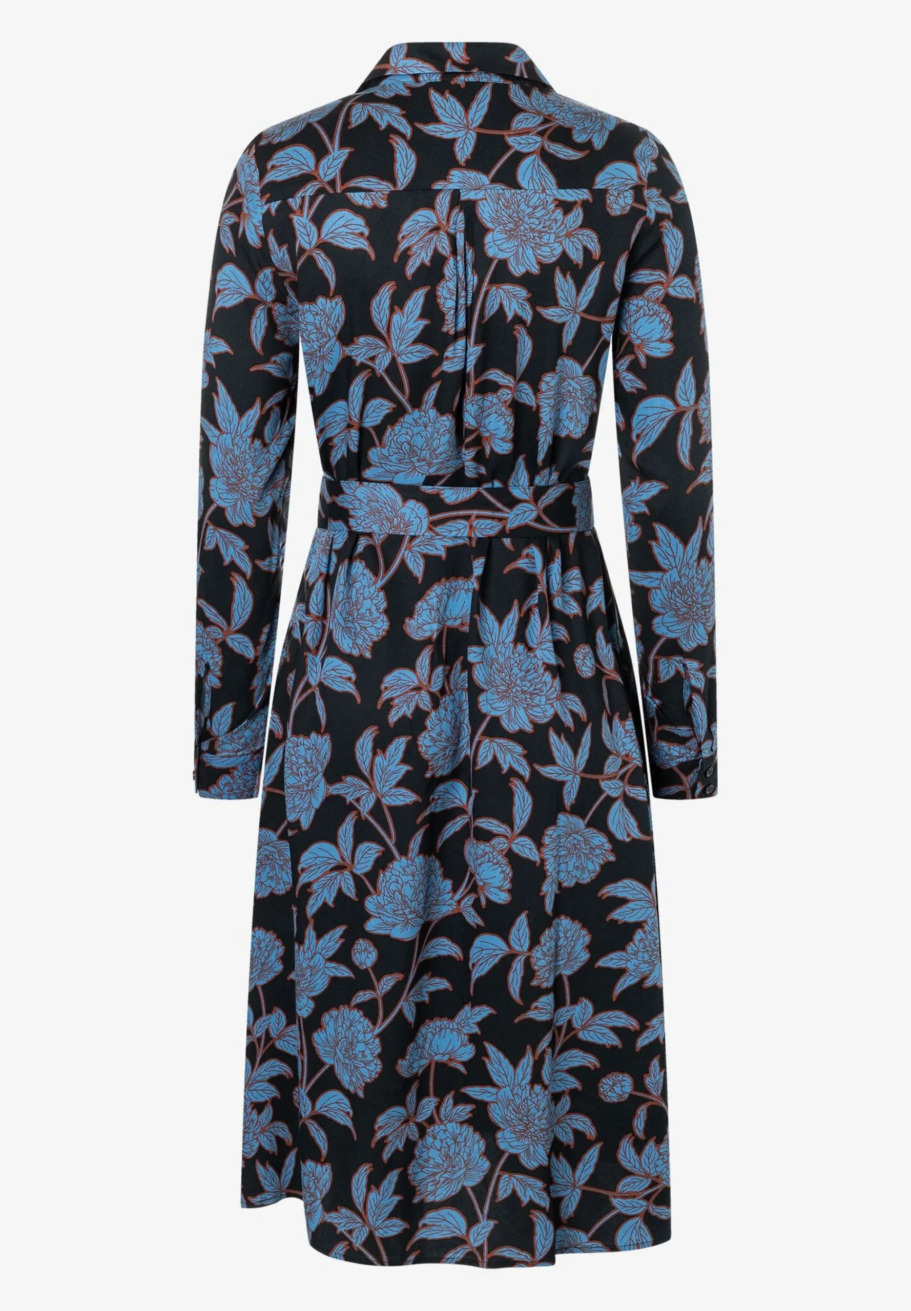 Das fließende Hemdblusenkleid von MORE & MORE mit floralem Allover-Print auf schwarzem Fond und Bindegürtel in der Tai…