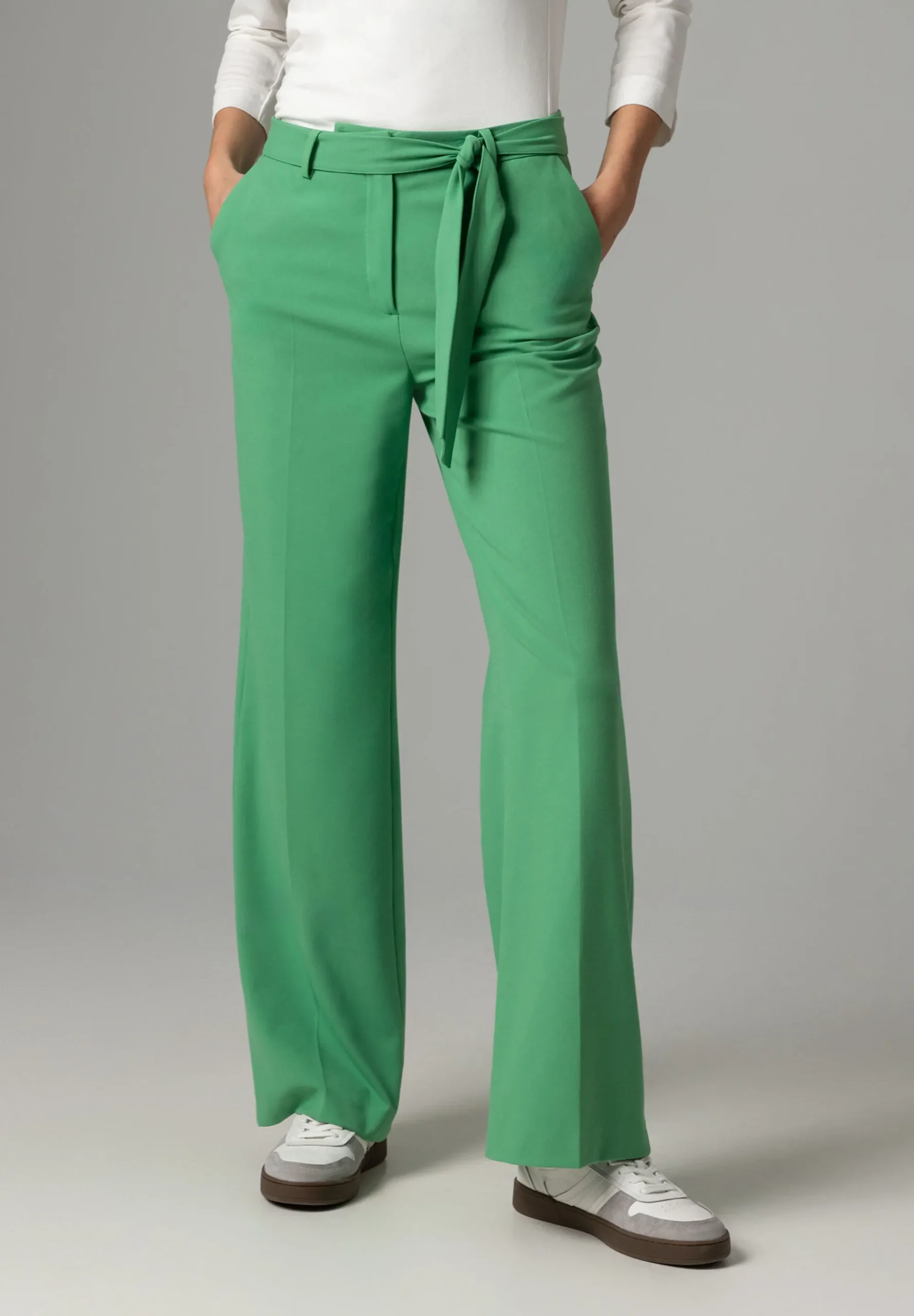Die moderne Hose von MORE & MORE mit weitem Bein und Bindegürtel kann elegant mit fließender Chiffonbluse und kurzem B…