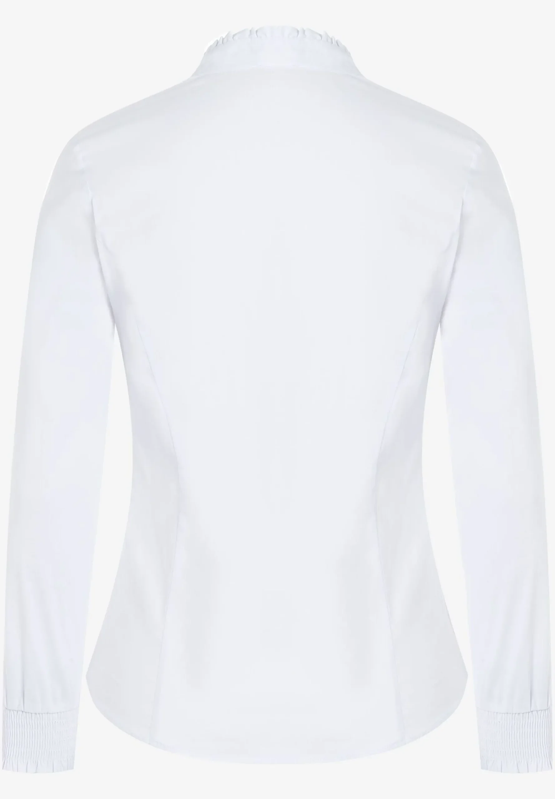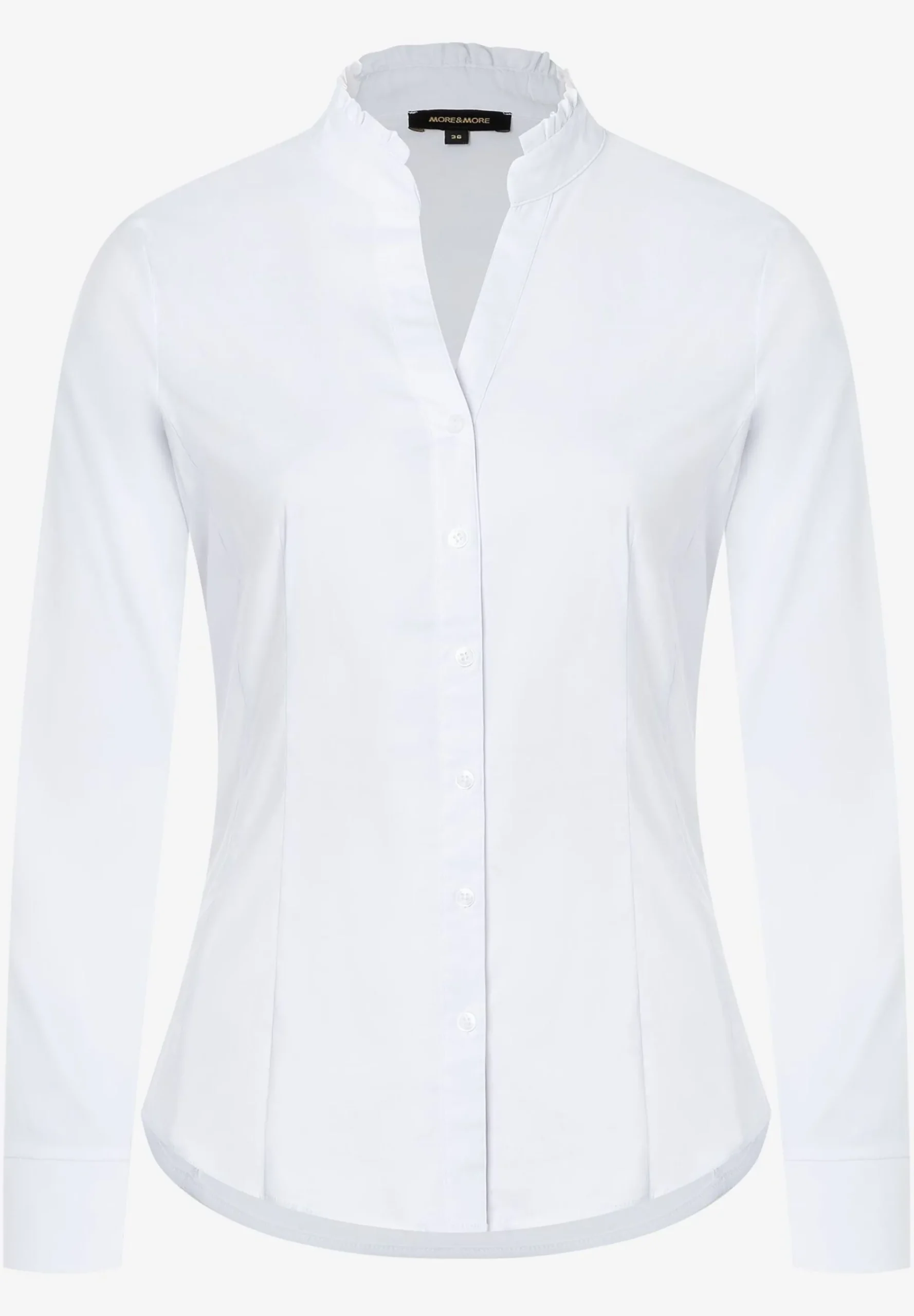 Die feminine Baumwoll/Stretch Bluse von MORE & MORE mit kleinem Stehkragen und Rüschenkante sieht unter Blazern, Cardigans und Pullovern gleichermaßen gut aus.