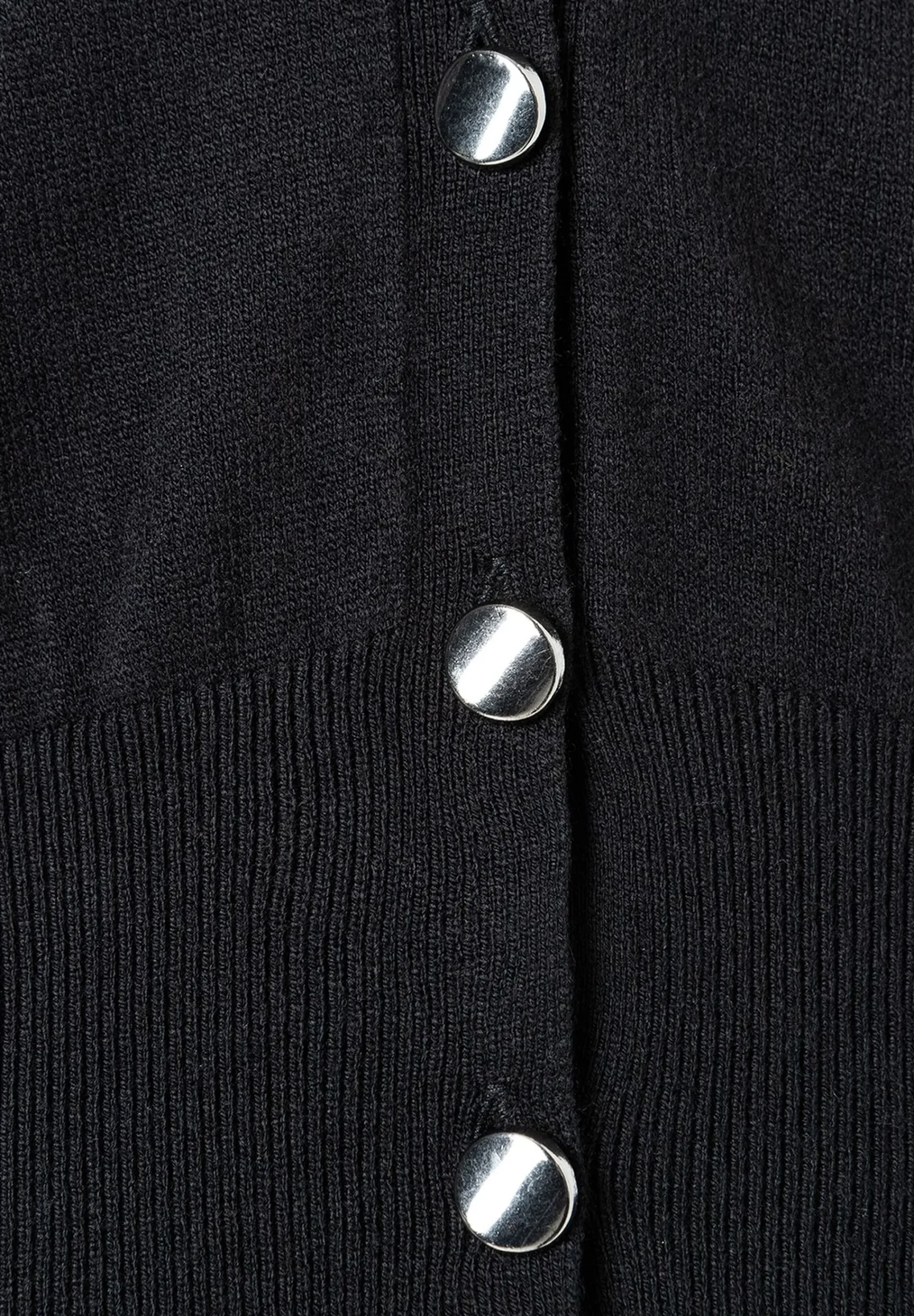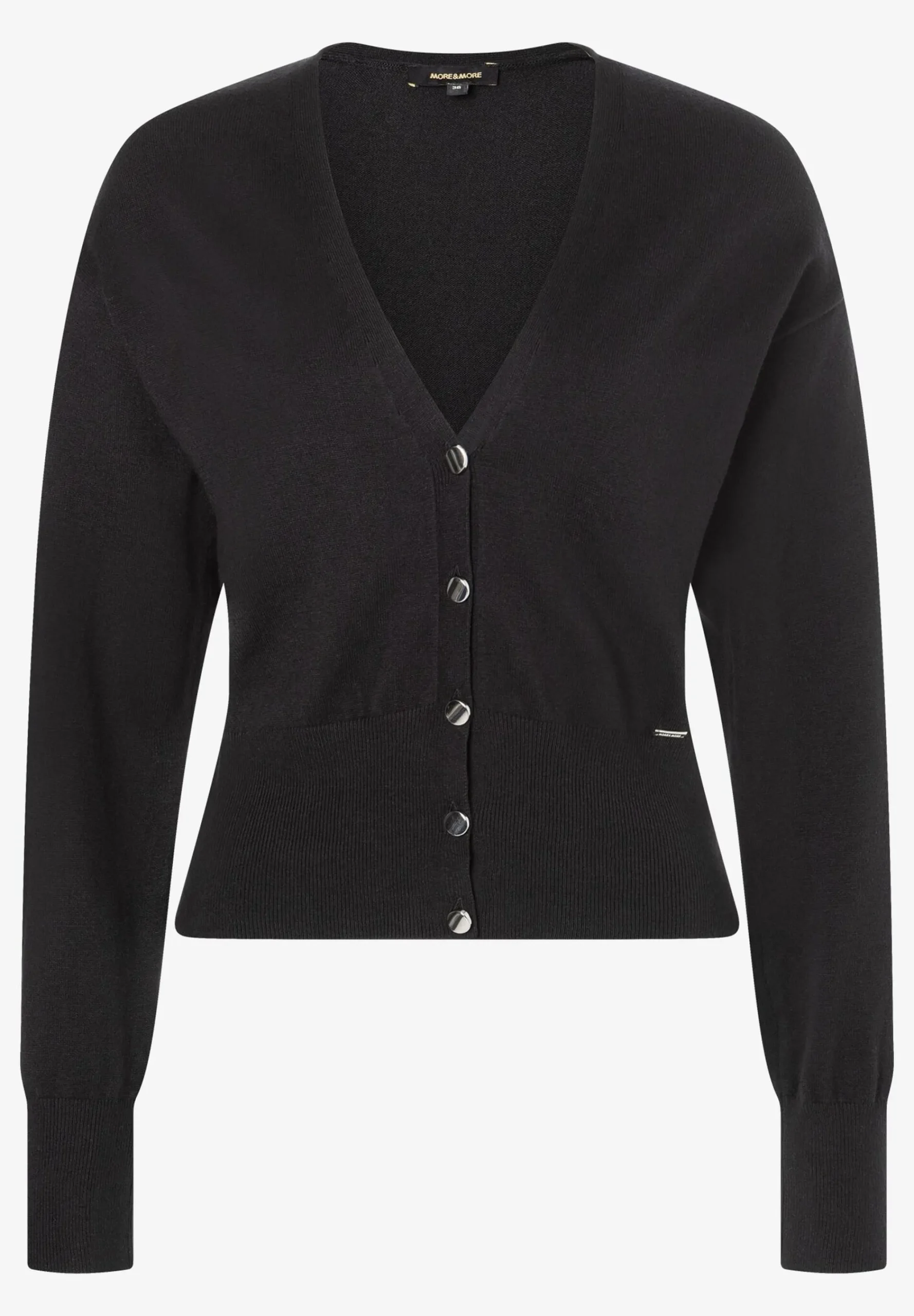 Der kurze Feinstrick-Cardigan von MORE & MORE mit dekorativen Metallknöpfen und breiten Rippbündchen kann zum fließendem Meshrock genauso gut gestylt werden wie zur weiten Marlenehose oder lässigen Jeans.