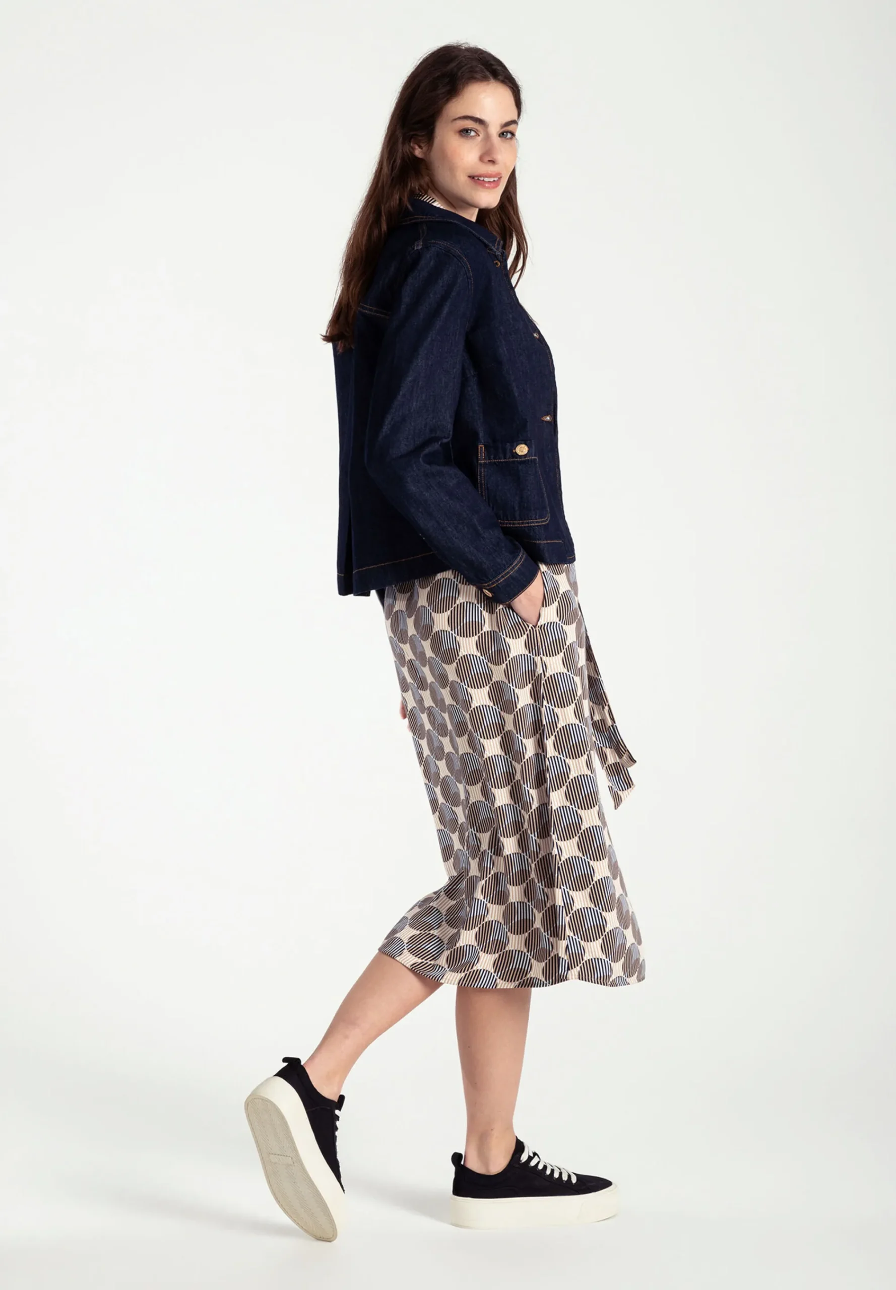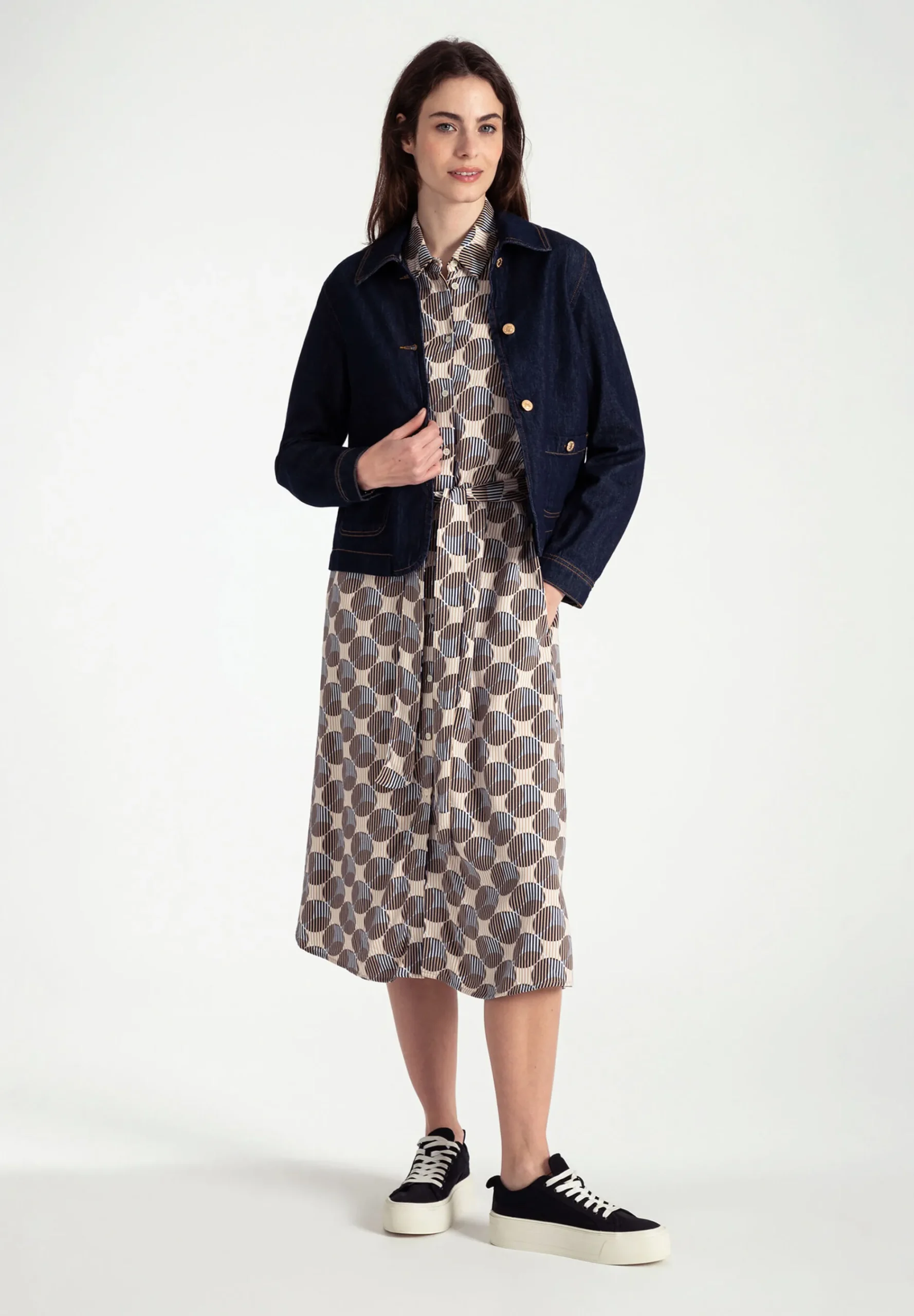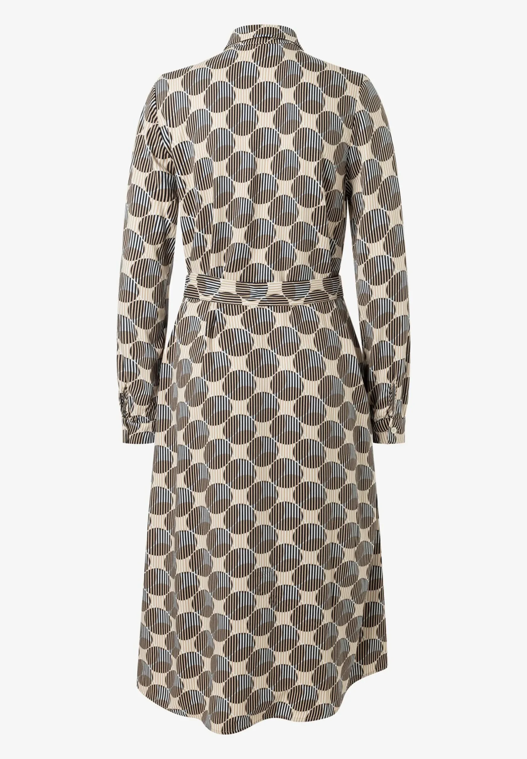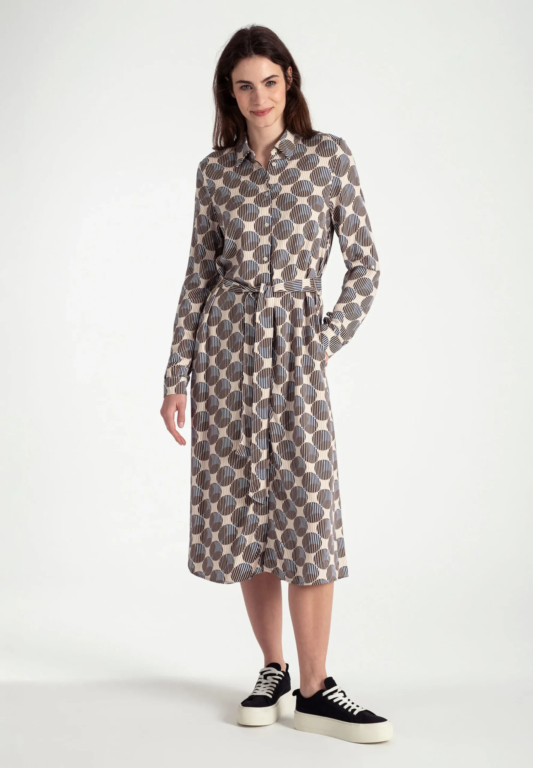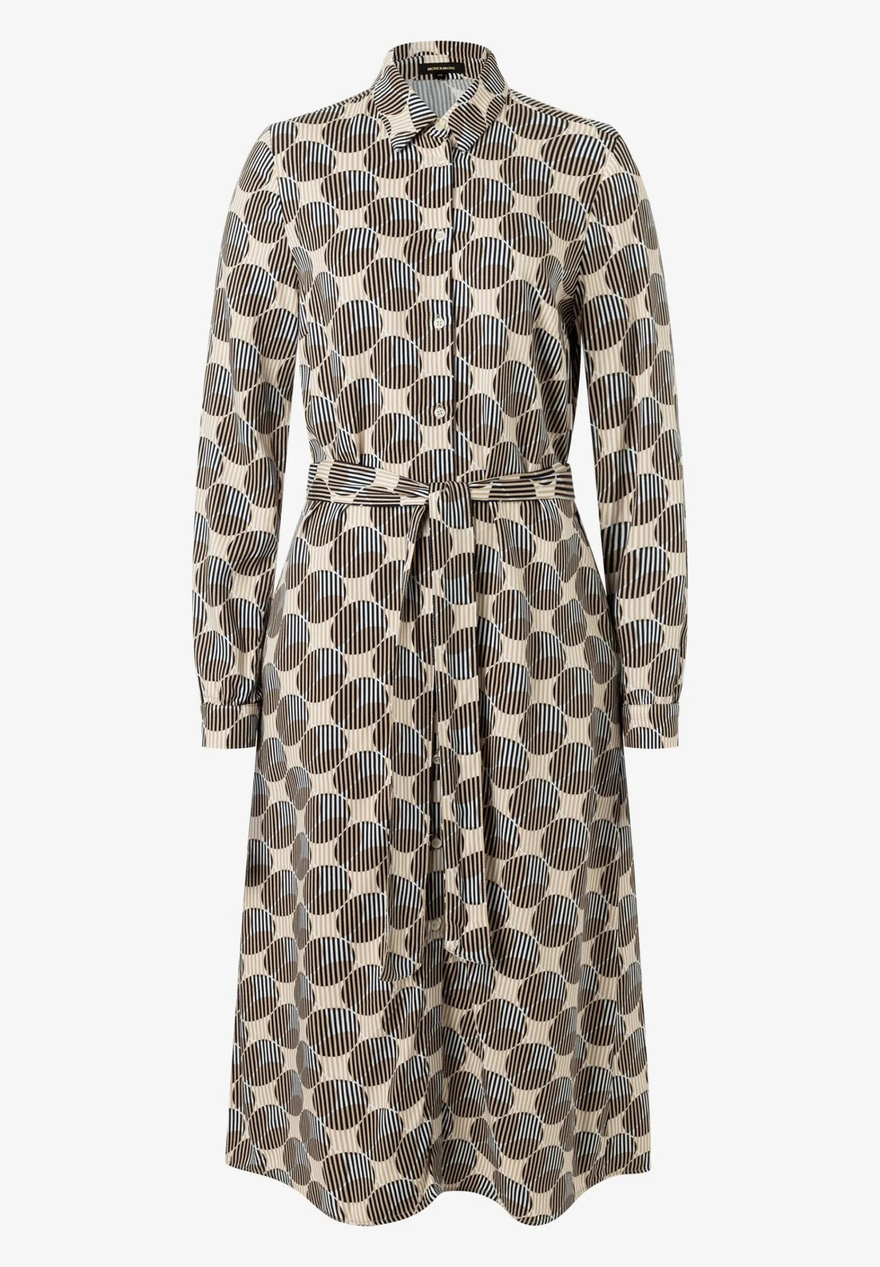 Das durchgeknöpfte Printkleid von MORE & MORE mit grafischem Print in marine/beige/mittelblau kann jetzt mit rustikalem Cardigan und Boots gestylt werden und bei steigenden Temperaturen mit Jeansjacke und Sneakers.