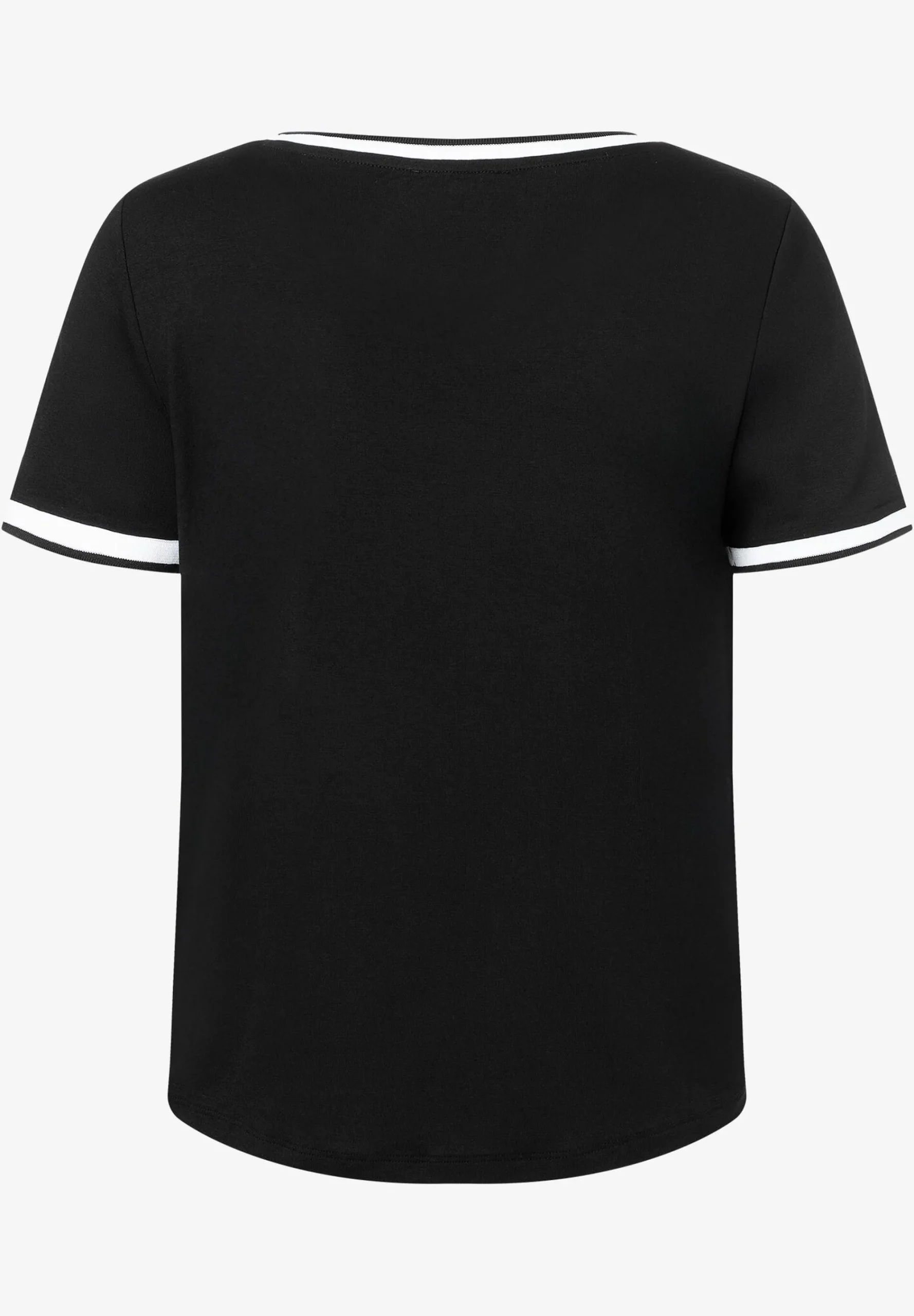 Das feminine Shirt von MORE & MORE mit fließender Webfront und hellen Kontrast-Abschlüssen bietet eine tolle Mischung …