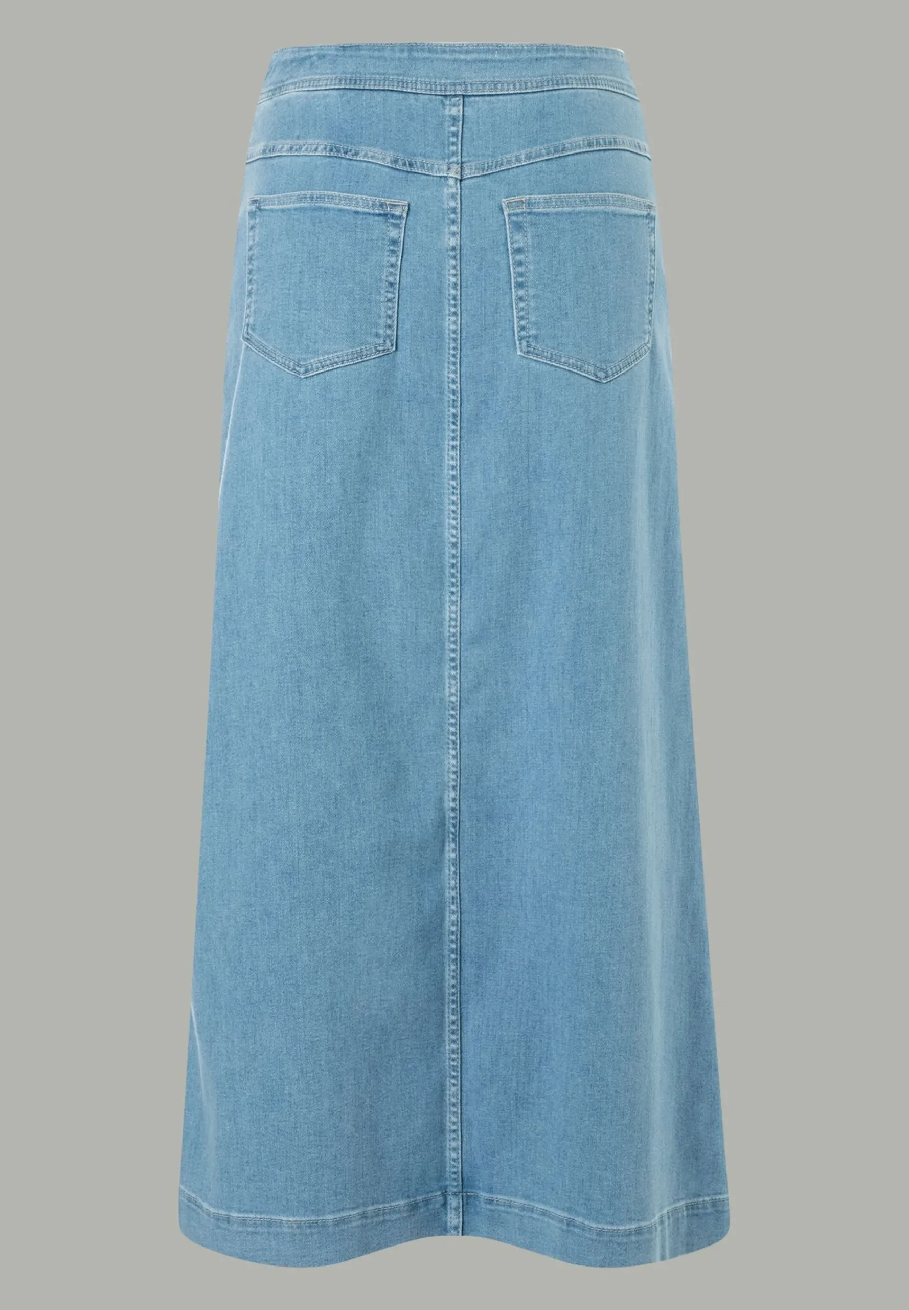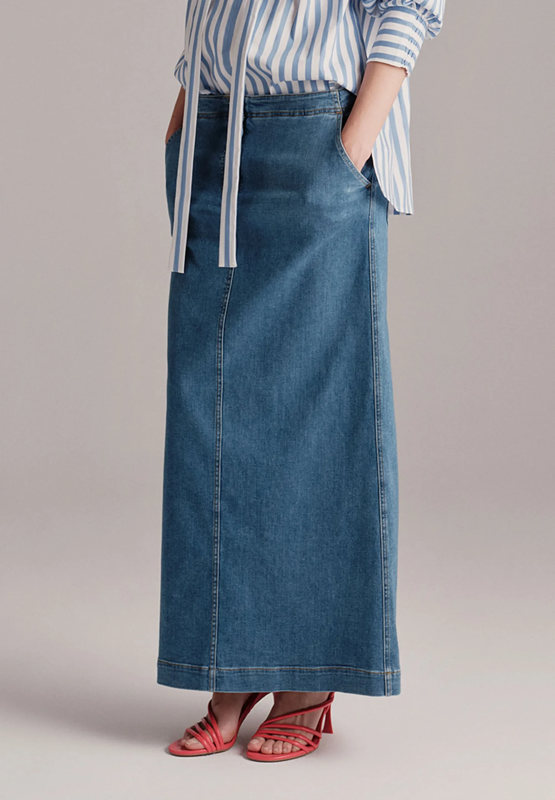 Der extralange Jeansrock aus unserer neuen MORE Kollektion ist wahnsinnig vielseitig kombinierbar. Besonders cool sieht er im Denim Allover-Look aus, kann aber auch ganz lässig mit weißem T-Shirt und Sneakers gestylt werden.