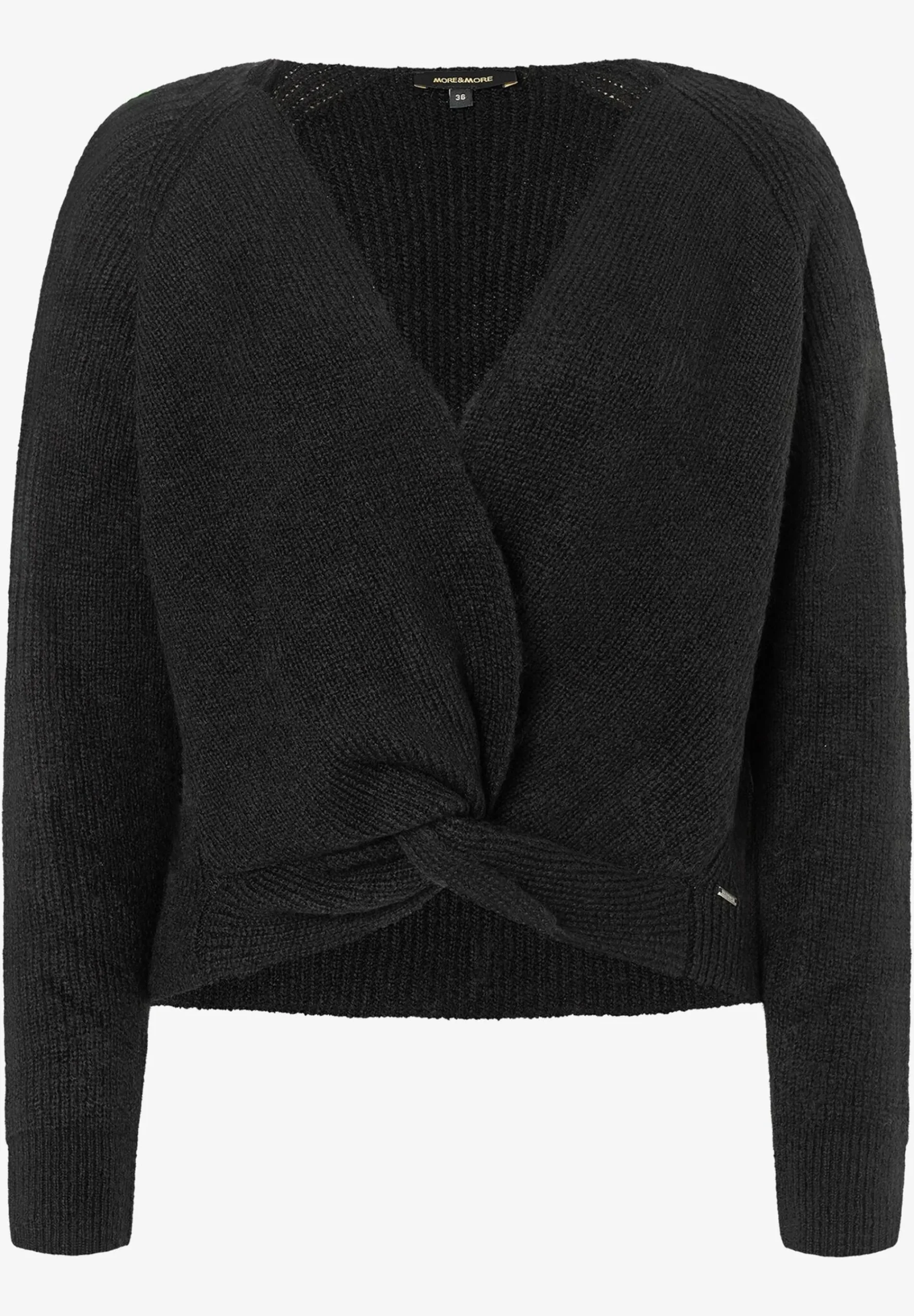 Der kurze Strickpullover von MORE & MORE mit V-Ausschnitt und raffiniertem Knotendetail kann perfekt über Blusen oder Shirts getragen werden und sorgt für einen modernen Look.